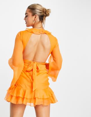 Asos Design Ruffle Mini Dress With Waist Tie And Flare Sleeve In Orange Asos