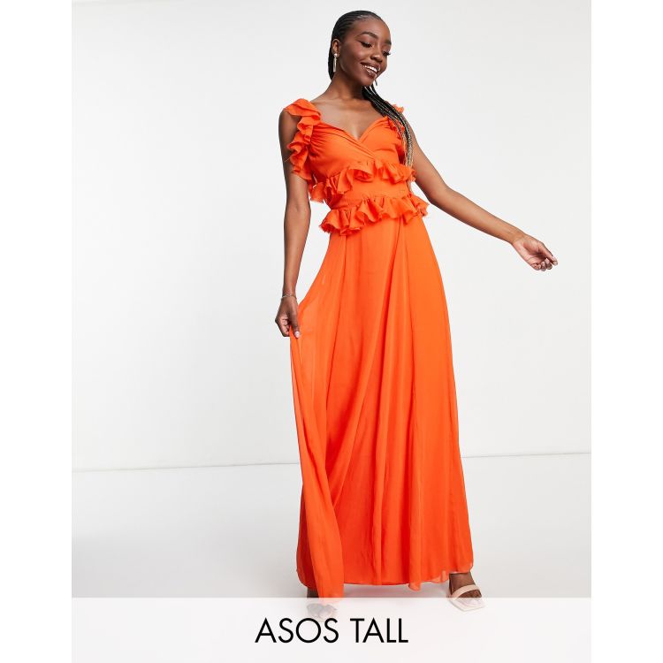 Asos Design Tall Tiered Ruffle Maxi Dress With Tie Back In Orange Asos